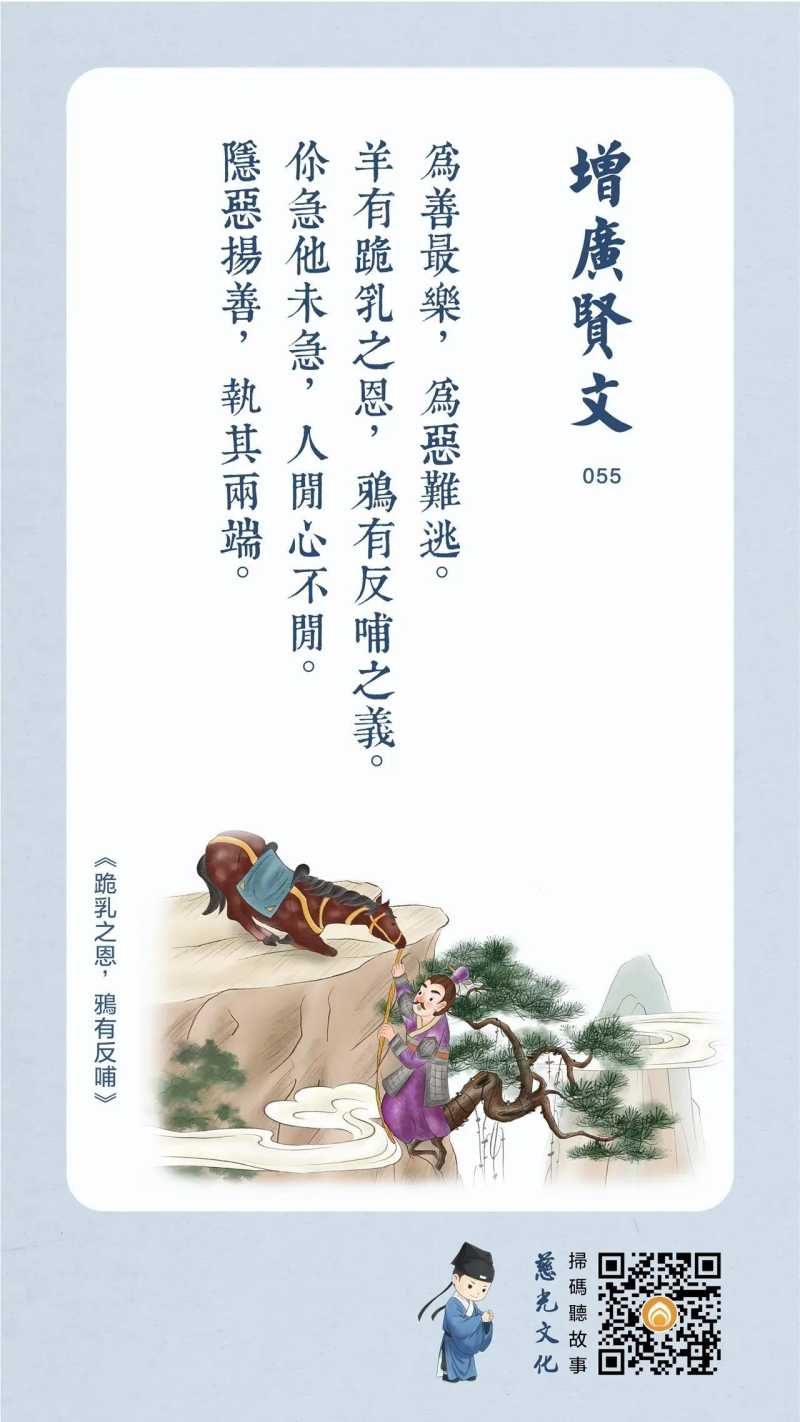 知恩报恩、孝亲尊师是一切善的根本。这里我们引用一首《西江月》来阐释经文的含义,词曰:马有垂缰之义,犬有湿草之仁。羊羔跪乳报母恩,猿偷仙果自奔。蛛织罗网护体,鼠盗余粮防身。梅鹿见食等成群,无义之人可恨。这首词经常在评书中作定场诗,其中每一句都是一则典故,我们举其中几个例子来阐释经文的含义。“马有垂缰之义”,说的是前秦皇帝苻坚在一次战役中被打败,逃跑的途中失足掉下悬崖,正巧被一棵树给接住了,但是由于山崖太陡,苻坚爬不上来。他的战马见此情景,便向苻坚垂下缰绳,可是苻坚仍然抓不到,于是战马便跪在地上,将缰绳垂下,待苻坚抓牢后,将他救了上来。“犬有湿草之仁”出自《太平广记》,讲述唐代太和年间,广陵人杨生有一只爱犬,在一个寒冷的冬日,杨生喝醉酒趟在荒草中睡着了,而草堆突然起火,情势紧急。广陵的狗狂吠但主人都没醒,于是这只狗就数次跳入冰冷的水中,以水润湿四周的干草,使主人得以脱险。“羊羔跪乳报母恩”,说的是小羊吃奶时,两条前腿会跪在地上,所以自古以来人们都以此来劝孝。“猿偷仙果自奔”,说的是传说孙膑早年跟随鬼谷子在山中学艺,鬼谷子命孙膑看管桃园。有一只修炼成精的白猿来偷仙桃,结果被孙膑抓住了,孙膑问它为何偷桃,小白猿说它的母亲快要病死了,仙桃可以为母亲治病。孙膑听后很受感动,于是请示老师,将仙桃送给了小白猿。“蛛织罗网护体”,说的是传说在元朝末年,朱元璋在一次战斗中兵败而逃,后面的敌人紧追不舍。逃到河南淮阳时,朱元璋看到一座破败的太昊伏羲氏祠堂。走投无路之下,他便来到伏羲氏的像前跪地祈祷说:“您要是能保佑我躲过这一劫,待我得天下之后,一定给您再塑金身,按照皇宫的规模来重修祠堂。”然后就躲了起来。这时不知道从哪里爬出一只蜘蛛,很快的在门上织出一面网。当追兵赶来时,看到门上的蜘蛛网,猜测里面应该没人,便转身向他处追寻,朱元璋因此而躲过一劫。后来他得天下之后,果然兑现了他的诺言,比着皇宫的规模重修了一座十进院落的伏羲祠堂。“鼠盗余粮防身”,说的是传说唐太宗李世民西征突厥的过程中中了敌人的空城计,由于军队所携带的粮食有限,便派遣人去搬救兵。正在李世民发愁粮草不足时,有士兵报告说挖出许多老鼠洞,洞里堆积了好多粮食。最终大唐的军队凭借老鼠洞中的粮食等来了救兵,从而化险为夷。“梅鹿见食等成群”,是在佛家典籍中记载的这样一个故事:曾经有一位国王喜欢吃鹿肉,于是每天都出去打猎。鹿群的鹿王见此情景便去面见国王说:“因为您每天去打猎,使我们鹿群没办法过安稳的生活,以后我们每天送一头鹿过来,希望您不要再去猎捕。”国王听后便答应了。有一天轮到一头怀孕的母鹿,它便去询问鹿王能否宽限几日,待自己生下小鹿后再去。鹿王同意了,然后独自到国王那里,表示愿意替母鹿受死。这件事情被鹿群知道了,它们纷纷涌到都城来见国王,都愿意替鹿王受死。国王见此情景深受感动,从此再也不吃鹿肉了。最后一句“无义之人可恨”,便是在告诫我们,人如果不讲道义,那真的是连禽兽都不如,怎么还能称为“万物之灵”呢?