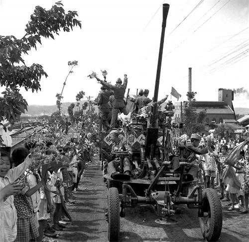 1958年7月13日,中国人民志愿军归国部队的炮兵部队受到安东市(今辽宁省丹东市)人民的热烈欢迎。新华社