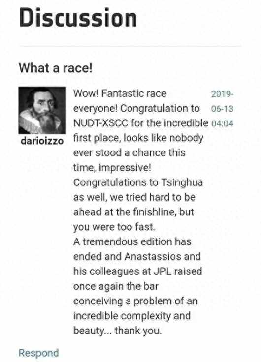 (内容翻译如下:wow,精彩的比赛!向不可思议的第一名NUDT-XSCC队伍致敬,这一次他们的优异表现让其他队伍根本毫无机会,让人印象深刻。同样祝贺清华大学,我们的队伍在比赛末段非常尽力追赶,但你们实在是太快了。我们刚刚完成了非常精彩的一个<软件>版本,Anastassios和他在JPL的同事再次在这个集复杂和美学于一体的问题上更上一层楼,谢谢你们。)
