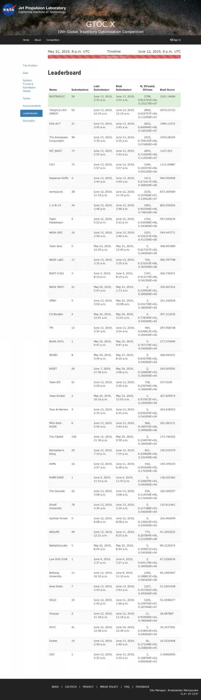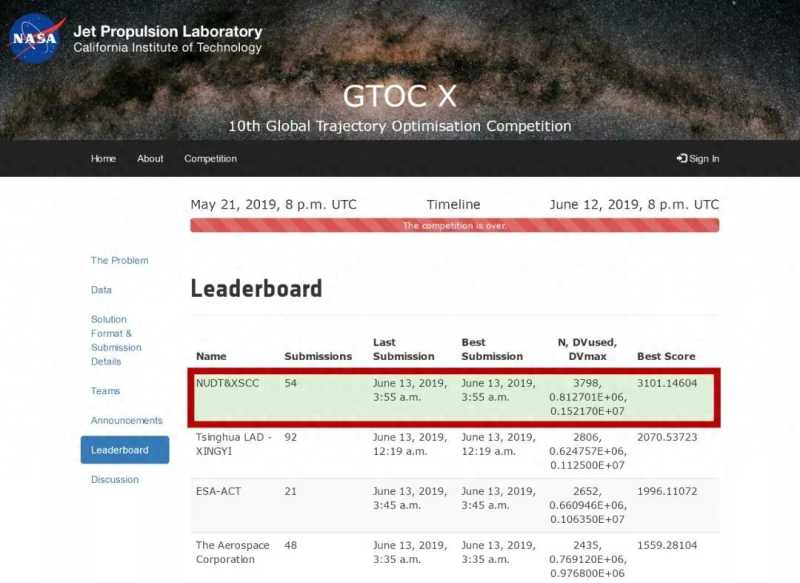 在今天凌晨四点结束的第十届国际空间轨道设计大赛(GTOCX)中,国防科大代表队实现了中国参赛队伍的首次夺冠,一举打破了欧美参赛队对该赛事冠军的垄断。