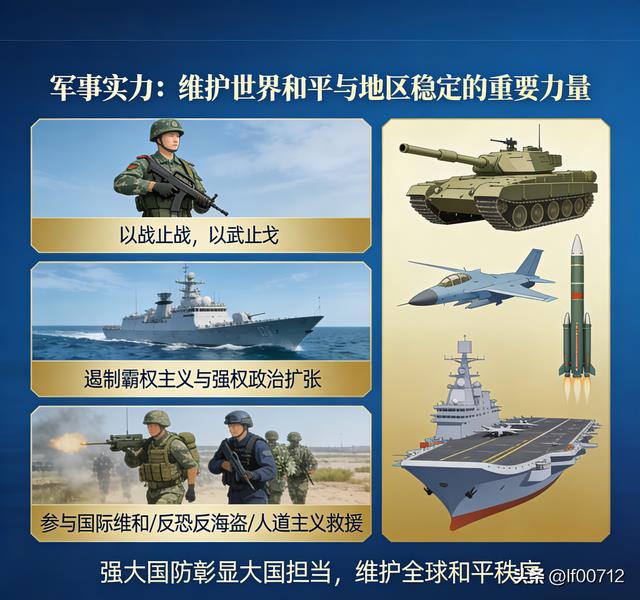 军事实力是维护世界和平与地区稳定的重要力量。强大的国防并非为了挑起战争,而是为了以战止战、以武止戈。足够的军事威慑能够遏制霸权主义与强权政治的扩张,阻止冲突升级,维护地区与全球的和平秩序。在国际维和、反恐反海盗、人道主义救援等行动中,强大的军事力量能够展现大国担当,为世界和平与发展贡献力量,彰显负责任大国的形象。