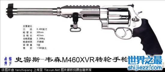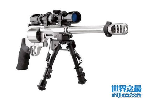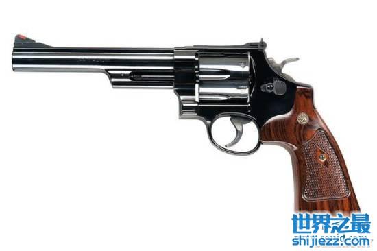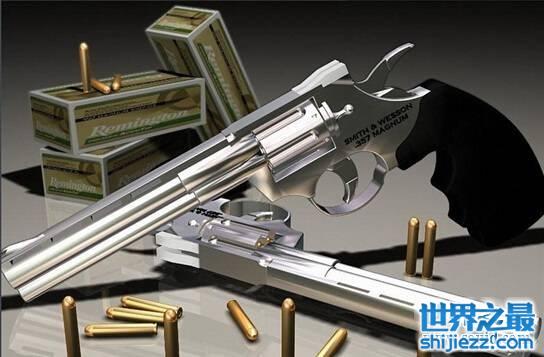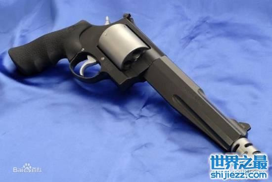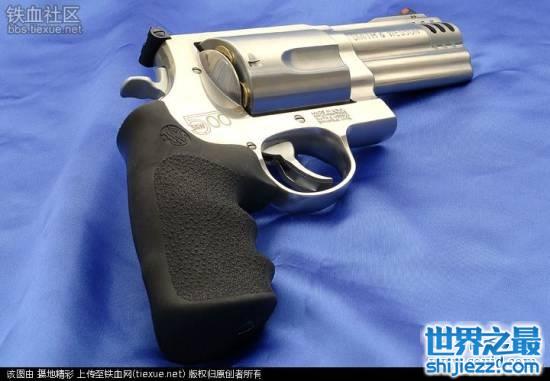 美国史密斯.韦森公司研发的M500转轮手枪,号称是世界上威力最大的枪,而且M500转轮手枪在手枪也是非常知名的,这主要得益于它的大口径,此枪为12.7mm口径,发射.50马格努姆大威力手枪弹,由于子弹太大,一般的转轮手枪弹膛能装六发弹,而M500转轮手枪只能装下五发。