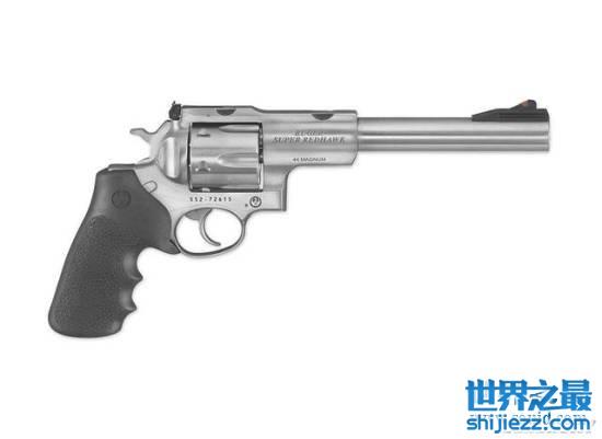 美国鲁格公司的超级红鹰,有两种口径,一种是0.454,另一种是0.480。因为可以装6发子弹,比大多数大威力左轮要多一发。它还罕见的使用了短枪管,方便携带,但是发射时火光非常猛烈。