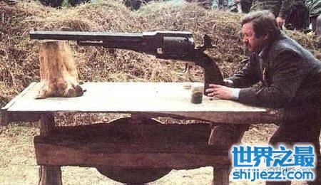 这把看起来都不是一般枪叫Zeliska转轮手枪,是奥利地Pfeifer公司生产的,Zeliska转轮手枪的口径大的惊人,达到恐怖的口径15.24mm,这比很多狙击步枪口径还大,重6公斤,长550mm,转轮部分就重2.04公斤,这么重的转轮是不可能像目前流行的转轮手枪那样“甩”出来装填,而只能像旧式的单动转轮手枪那样打开一个装填口,一发一发地装进去,同M500转轮手枪一样,Zeliska转轮手枪也只能装5发子弹。
