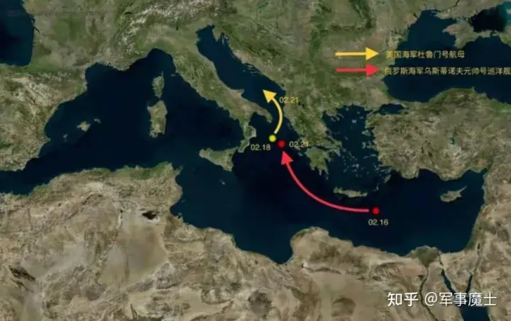俄乌开战前3天,两艘巡洋舰会师地中海。恰巧,这个时候的杜鲁门航母舰队已经开到了亚平宁半岛的南端。航母编队的美军指挥官眼看着俄军舰队已经开到了克里特岛附近,为了不和俄军迎面相向,美军扭头窜进了亚得里亚海。