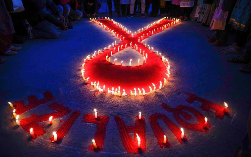 当地时间2022年11月30日,尼泊尔加德满都,在世界艾滋病日前夕,来自人道救援组织“Maiti Nepal”的人们在一条红丝带周围点燃蜡烛。