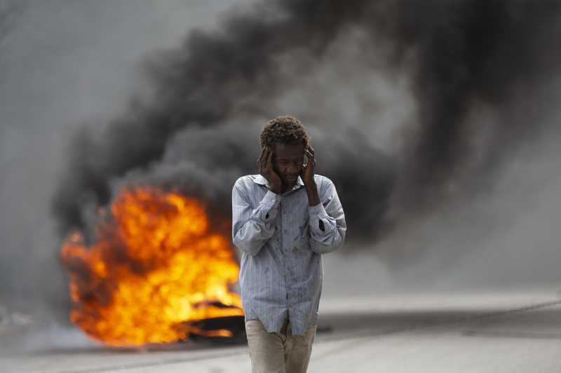 当地时间2022年10月30日,海地太子港,一名男子走过燃烧的路障。