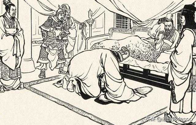 公元222年,刘备东征东吴,发起夺荆州,报弟仇战争,史称夷陵之战,最后被陆逊一把火火烧连营七百里,战败撤退至白帝城,诸葛亮大叹:“可惜法正故去,否则必能阻止陛下东征之举。”公元223年,刘备病重,召诸葛亮到白帝城,与李严一起托付后事,刘备对诸葛亮说:“你的才能是曹丕的十倍,必定能够安顿国家,终可成就大事。如果嗣子可以辅助,便辅助他;如果他没有才干,你可以自行取度。”诸葛亮涕泣地说:“臣必定竭尽股肱的力量,报效忠贞的节气,直到死为止!”刘备又要刘禅视诸葛亮为父。同年四月,刘备逝世,刘禅继位,封诸葛亮为武乡侯,开设官府办公。不久,再领益州牧,政事上的大小事务,刘禅都依赖于诸葛亮,由诸葛亮决定。