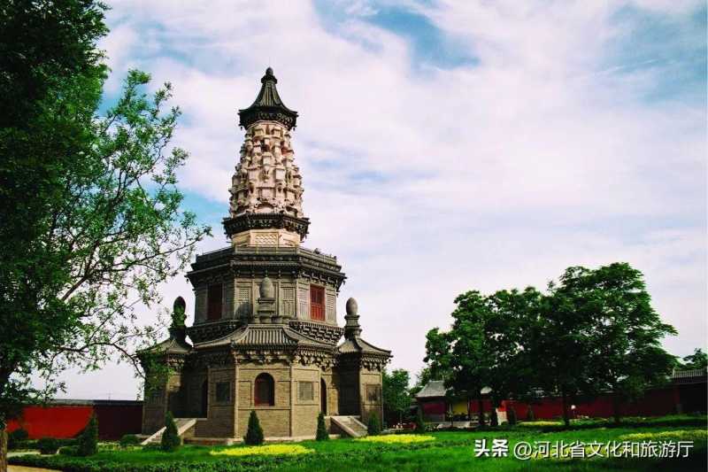 被著名古建专家梁思成先生称为“海内孤例”的正定广惠寺多宝塔(华塔),始建于唐贞元十一年(795),宋、金时大修。主塔三层,四隅各有一单层小塔与之相连,将主塔一至二层环抱其中,其奇特的平面布局全国现存为数不多的其他花塔所不能比拟的。