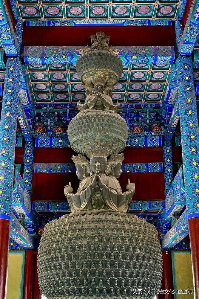 正定隆兴寺中轴线末端,由崇因寺迁来的毗卢佛,是明神宗皇帝与生母慈圣皇太后御制的,举高6.72米,自下而上逐层渐收,似一座宝塔,表层均鎏金。全身分三层,每层均有四尊毗卢佛,头戴五佛冠,手作毗卢印,结跏趺坐,三层莲座的一千个莲瓣上都铸造有一尊小佛像,形成千佛绕毗卢佛的格局。