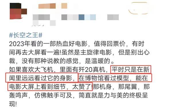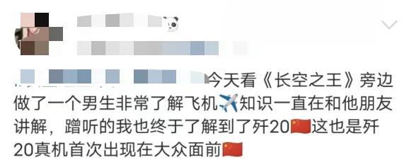 还有人说在看电影的时候注意到有观众一直热情地给旁边的朋友介绍歼-20,电影院都快变成歼-20的粉丝见面会了。