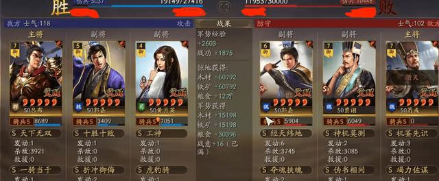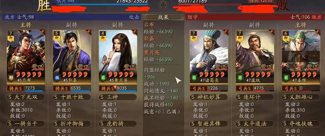 吕布,队伍核心,三势阵增加了他的发动概率和伤害,发挥效果呈指数增长,技能携带高输出突击战法即可,不固定,摧峰断刃,鬼神雷霆都行。