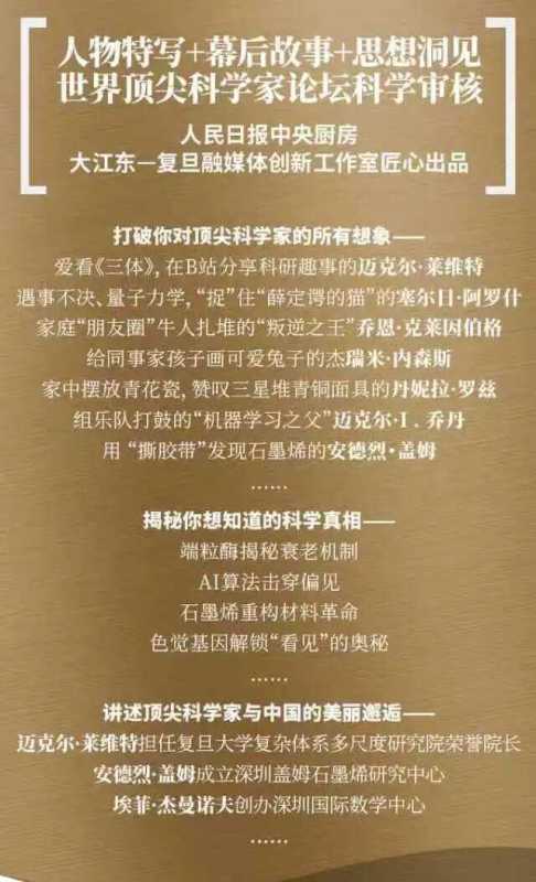 这本世界顶尖科学家访谈录,便源于一群复旦大学新闻学院年轻学子对科学精神的虔诚追寻。他们在“大江东—复旦融媒体创新工作室”的平台上,在人民日报资深记者和复旦大学资深教授的引领下,洞开十位全球顶尖科学家的智慧之门,用文字和影像记录下他们的科学探索、人生感悟和近乎奇异的故事。这些融媒体作品,不仅是传递科普,也是一场跨越学科、年龄与文化的对话,更是科学精神投注在当代中国青年学生身上的生动注脚。