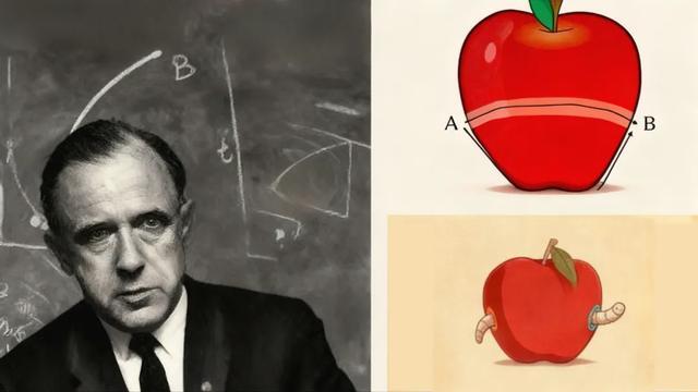 惠勒在一次演讲中说:“想象一下,我们的宇宙,就是一只苹果的表面。一只蚂蚁,想要从苹果的顶端,爬到底部。在它看来,这是一段非常遥远、曲折的漫漫长路。这,就相当于我们在三维空间中,进行常规的星际旅行。但是,如果有一条蛀虫,从苹果的内部,直接蛀出了一条通道,连接了苹果的顶端和底部呢?对这只蚂蚁来说,它就有了一个选择。它可以不再辛苦地绕着苹果皮爬行,而是直接钻进这条由蛀虫打通的隧道——一条‘虫洞’(Wormhole)——从而以一个极短的距离,就抵达了目的地。”
