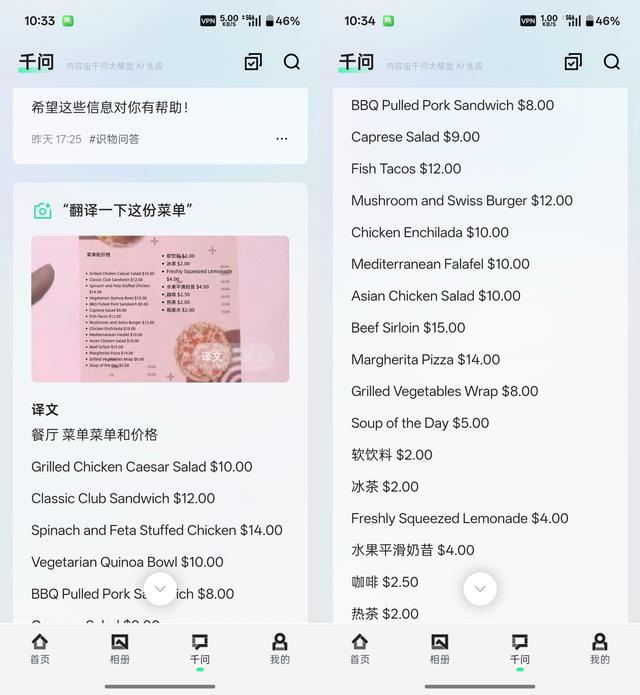 同样体现显示价值的还有「随身翻译」功能,支持单向或者双向的对话翻译,在眼镜上同步显示和语音翻译。此外,通过夸克同学随时就能进行拍照翻译,让它翻译眼前的菜单或者其他。