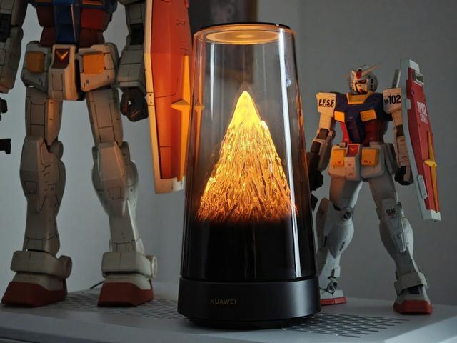 单看外观的话,你很难把它和路由器联系到一起,圆柱形机身,上半部分是渐变透明的外壳,里面是一座通过 500 余道复杂曲面雕刻出来的「雪山」,光一打上去,山体的纹理、起伏都非常立体,有点类似艺术台灯的观感。