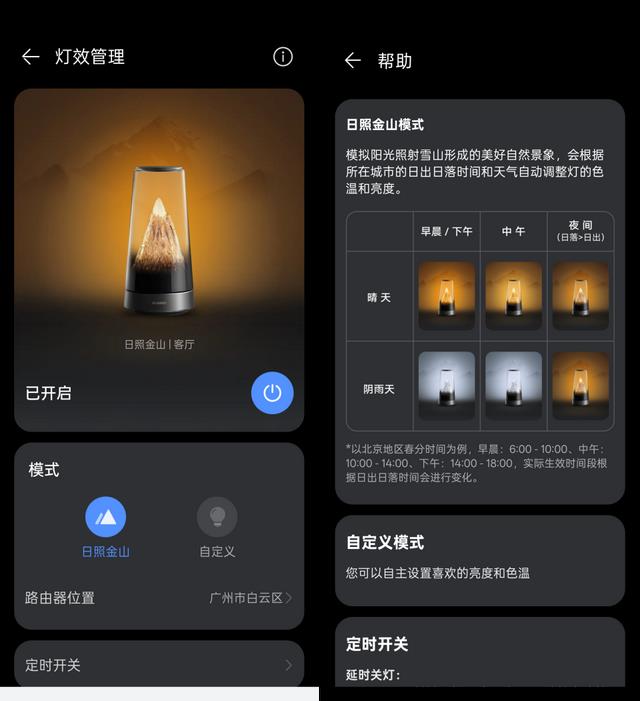 而且在设置中你还可以对光的色温、亮度进行调整,也可以让它根据当地的日出日落与天气,来调整灯效——晴天偏暖、阴天偏冷,早晚亮度不同,整个节奏跟现实同步。