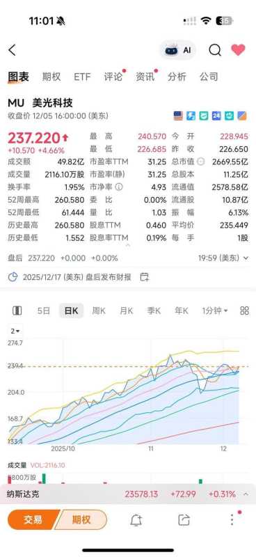 受此消息影响,美光科技12月6日股价大涨4.66%,收报237.22美元。