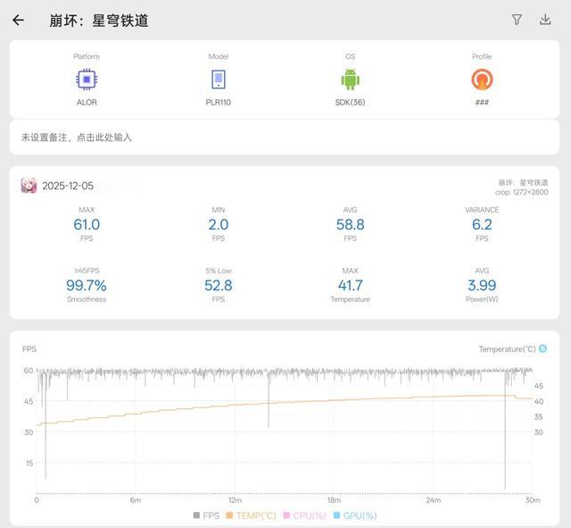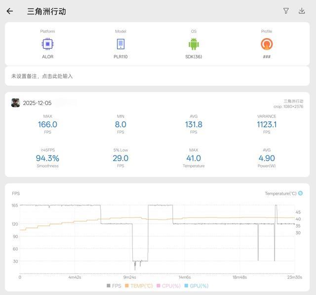 玩了大概25分钟,机身背部开始温热。毕竟是金属中框加玻璃背板,导热很快,在室温26°C的环境下,手感温度在43°C左右,属于热手但不烫手的范围。这也说明它的散热堆料是足的,没有因为积热而强行降频锁帧。