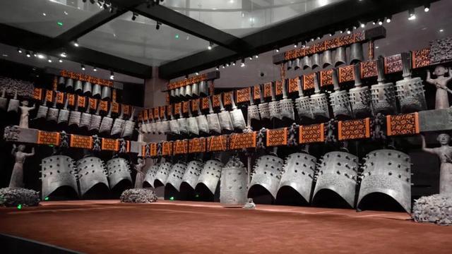 通过独特的合瓦形结构和科学的合金配比,每口编钟都能发出两个乐音,整套编钟音域横跨五个半八度,十二律俱全,仅比现代钢琴少两个八度。