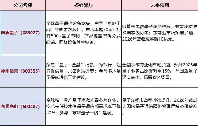 A股里聚焦量子通信的公司不少,比如国盾量子(688027),是国内量子通信的龙头企业,参与了“京沪干线”等多个重大项目,已经有稳定的政务、金融订单落地;神州信息(000555)则侧重量子通信在金融领域的应用,和多家银行合作推进量子加密支付试点;光迅科技(002281)在量子通信的光器件领域有核心技术,是量子通信设备的重要供应商(不荐股)。这些公司的优势在于技术壁垒高、商业化落地早,不用靠概念炒作,有实际的业务支撑。