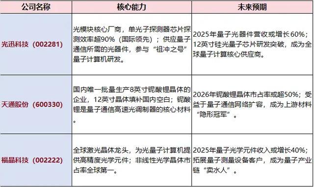 从“祖冲之号”到“京沪干线”,从实验室原型机到企业量产计划,中国在量子科技领域已经实现了从跟跑到并跑的跨越,A股里的国盾量子、科大国创、光迅科技等企业,也在各自领域实现了技术突破和商业化落地,万亿级赛道的红利正在逐步释放。