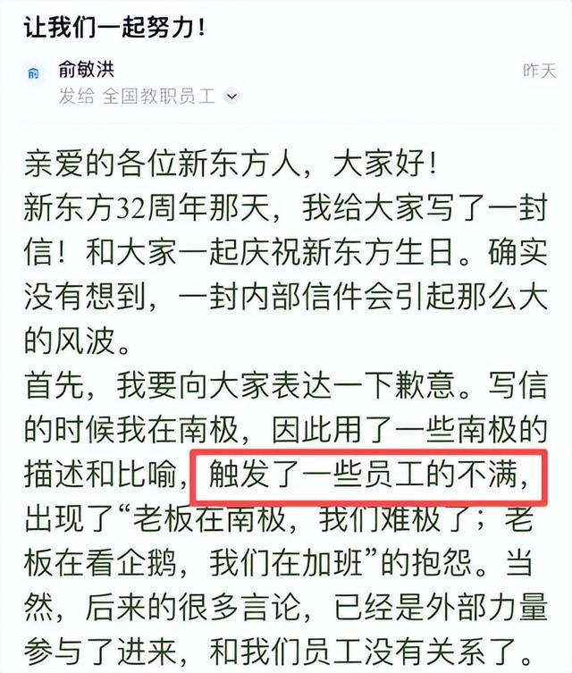 俞敏洪后面又连发了两次声明,还写了一封全员信道歉,说自己没想着炫耀,只是用南极的比喻没考虑到员工的感受,还承诺明年冬天要选 10 个基层优秀员工和 10 个东方甄选会员,公司出钱让他们去南极。