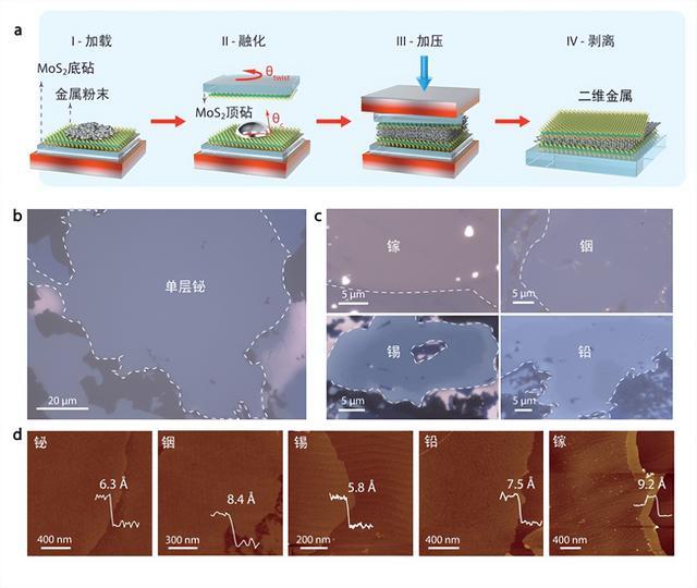 在这项研究中,中国科学院物理研究所研究员张广宇带领团队,发展了原子级制造的范德华挤压技术,通过将金属熔化并利用单层二硫化钼作为范德华压砧挤压,成功实现原子极限厚度下各种二维金属的普适制备。