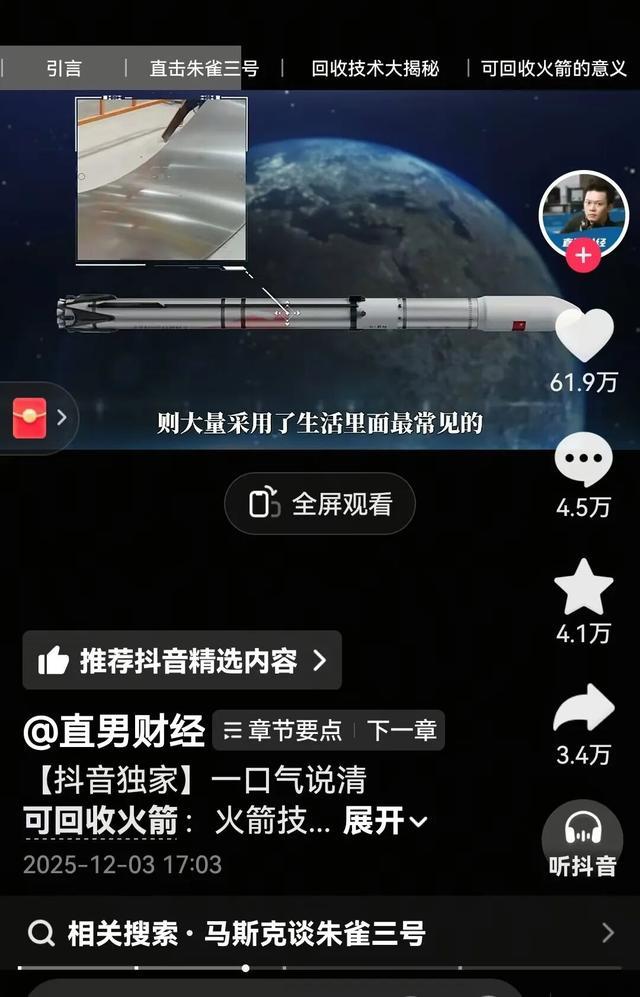 更关键的是,这些视频作者还创造了不少全网首次的纪录。比如@直男财经成为除央视外唯一获得授权进入朱雀三号火箭着陆点的团队,全程记录了我国第一枚民营轨道级可回收火箭从组装到发射的完整历程。