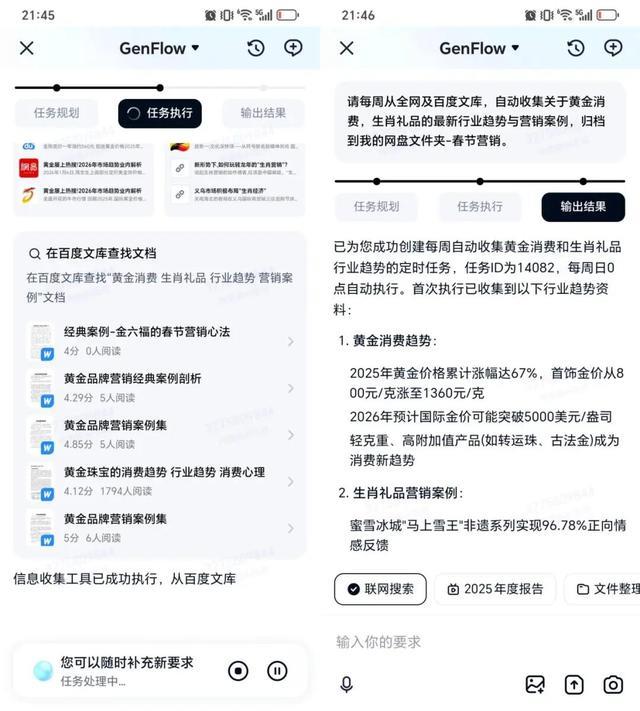 以一个具体的营销工作场景为例:一位品牌策划经理需要持续追踪春节消费趋势。在过去,这意味着需要手动、重复地在多平台搜索、下载并整理海量资料。现在,他可以通过GenFlow创建一个定时任务:“请每周从全网及百度文库,自动收集关于黄金消费、生肖礼品的最新行业趋势与营销案例,归档到我的网盘。”GenFlow便会启动智能工作流:自动执行全网搜索,将筛选后的报告、数据与案例,去重、命名并智能分类,存入网盘指定文件夹。