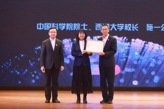 重庆一中校长毛明山和美术教师王洋,一同向施一公院士赠送了一份由王洋老师指导8名学生共同设计制作的多层纸雕灯作品《西湖大学—渝湖筑梦》。