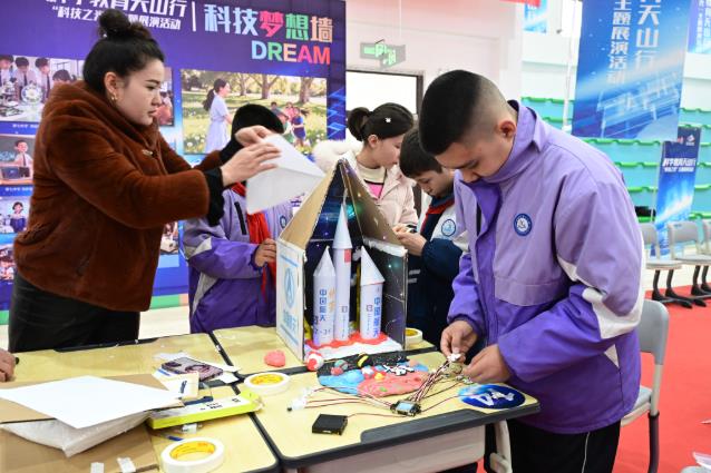 在杨福玉的展台不远处,来自疏附县辽园镇中心小学的艾米杜拉·伊马木正认真地向参观者介绍团队作品——一座用彩色黏土与卡纸搭建的中国航天模拟器。模型底座铺着红白相间的黏土,卡纸火箭点缀其间,LED灯珠如星辰闪烁,质朴的材料与辽阔的宇宙想象在此交织。