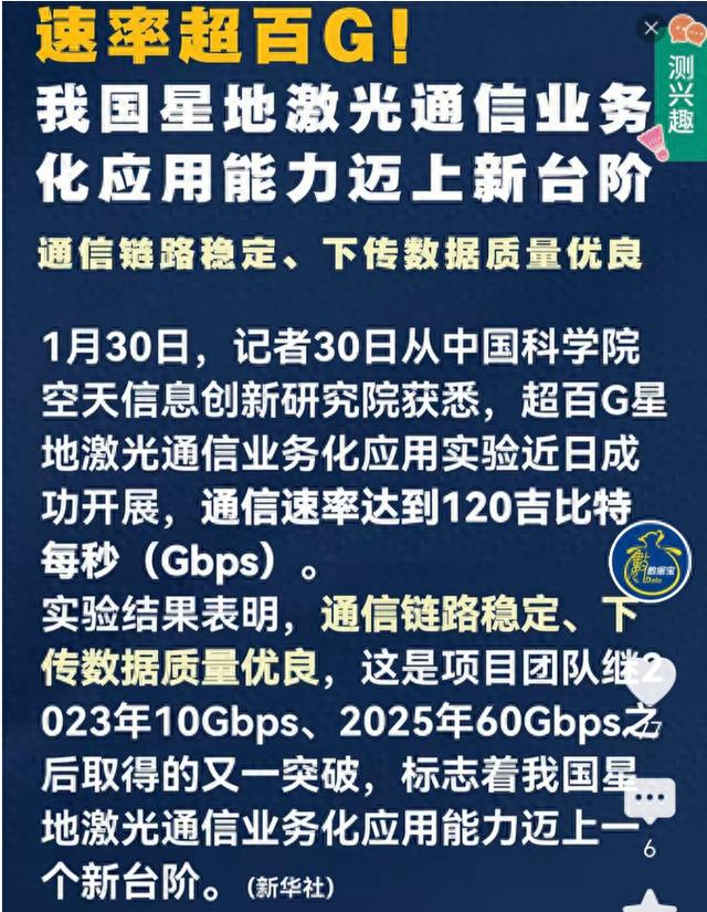 在太空通信领域,我国近期再获重大突破,成功开展超百G星地激光通信业务化应用实验,通信速率达到120Gbps(千兆比特每秒)。这是继2023年10Gbps、2025年60Gbps之后的又一跨越,标志着我国星地激光通信业务化应用能力迈上全新台阶,通信链路稳定、下传数据质量优良,比传统卫星通信速率提升10倍以上,为我国太空探索、6G发展筑牢技术根基。