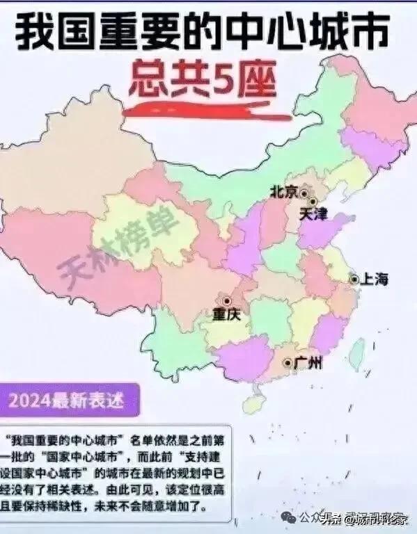 根据2025年国务院最新批复:目前我国仅有5座国家中心城市,它们分别是北京、上海、天津、重庆、广州。