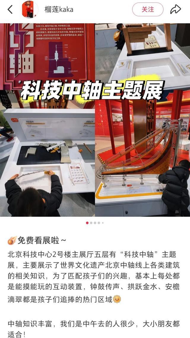 “2号楼主展厅五层有‘科技中轴’主题展……基本上每处都是能摸能玩的互动装置,钟鼓传声、拱跃金水都是孩子们追捧的热门。”