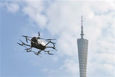 载人无人机在CBD上空飞行。