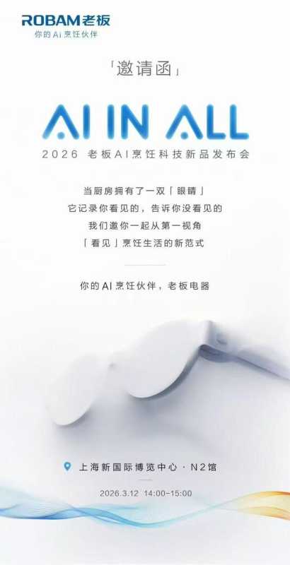 AWE2026期间,老板电器将在N2馆以全新的「你的AI烹饪伙伴」品牌定位首度亮相,展现软硬件一体化的智能体架构,并推动AI深度融入烹饪「全链路」。