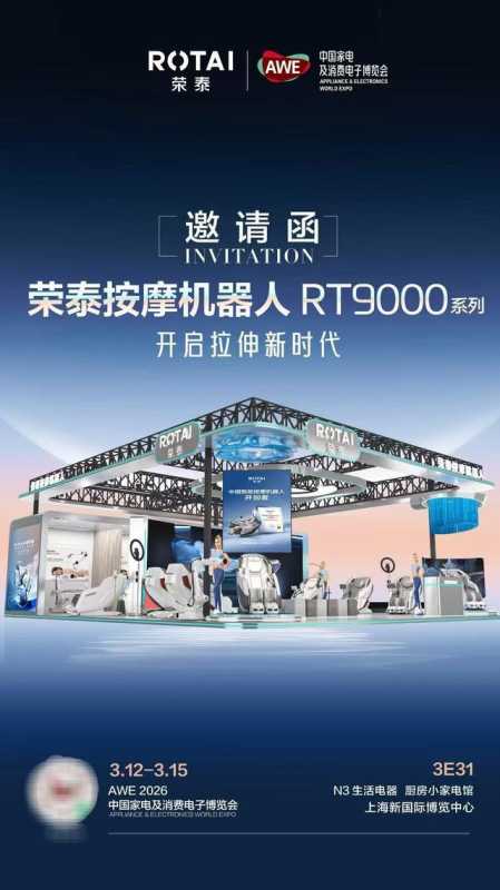 其中,荣泰将在AWE2026全球首发RT9000系列按摩机器人,带来行业首创的「动态分离缓压系统」。