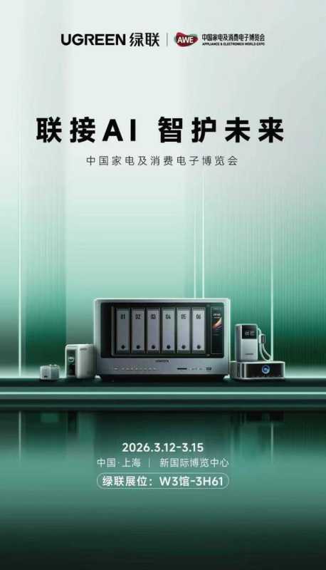 绿联科技也将首次参展AWE2026,以 「联接AI,智护未来」为主题,展示NAS私有云与全系列充电新品。