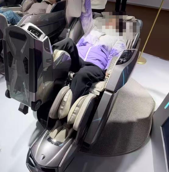 生活电器馆内,按摩椅品牌荣泰首发了RT9000系列按摩机器人。其突破在于全躯体动态分离缓压系统——可灵活拉伸四肢,打破了传统按摩椅只能固定揉按的局限,开创“边按摩边拉伸”的新体验。此外,扶手上的生物传感器能实时监测心率、血氧及疲劳指数,结合体型扫描技术和AI算法,最终生成贴合用户实时身体状态的专属按摩方案。