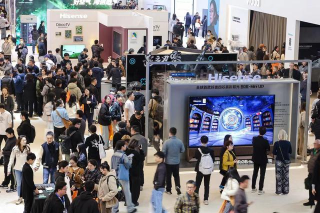 人气高的区域均集中在超千平的「大区」,主要被各大家电巨头承包,比如海信、TCL、创维、长虹、格力等。传统家电大类中,电视依然是「最显眼」的那位。上海新国际博览中心W5展馆,海信一家就独占了近半面积规模,靠着RGB-Mini LED等硬核科技,以及《黑神话·悟空》现场游戏互动设计,吸引了大量观众参观。