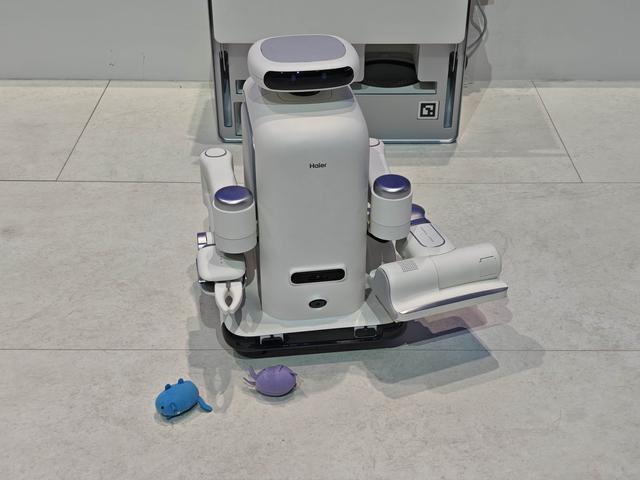 在家庭或家务场景下工作的具身智能机器人,不需要长脚,有轮子即可,而胳膊(机械臂)和手部(灵巧手)操作的灵敏性和精细化程度,正在成为各大家电厂商间比拼的焦点。以海尔为例,其在AWE一口气推出了落地「家务、清洁、陪伴」三大细分应用场景的家用机器人。