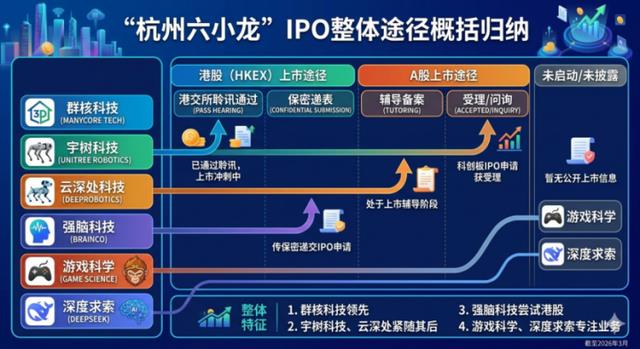 2026年3月,当群核科技通过港交所聆讯的消息传出来,这家公司离“全球空间智能第一股”的桂冠只剩一步之遥。而在它身后,宇树科技在冲刺“A股人形机器人第一股”,云深处科技紧锣密鼓推进IPO辅导,强脑科技秘密递交港股上市申请。“杭州六小龙”的集体资本化进程,正以从未有过的密度和速度展开。