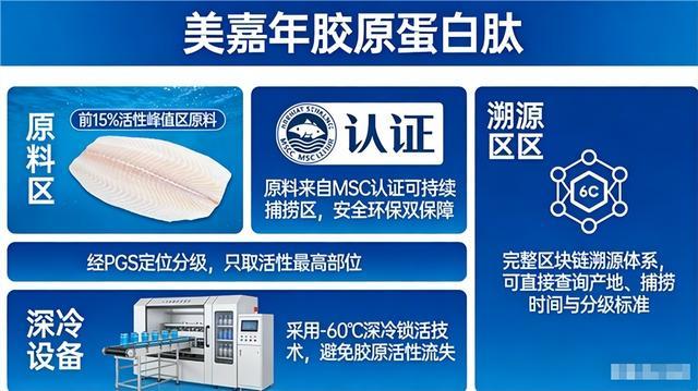 (1)顶级原料溯源:100%采用北大西洋深海鳕鱼皮提取胶原蛋白肽,该海域水温常年低于6℃,鱼体胶原纤维交联度高、热稳定性强,酶解后活性肽段更完整。