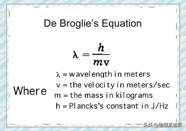 然后,他算出了这个波的波长公式:λ = h / p。其中p是粒子的动量。这就是著名的德布罗意波长公式。