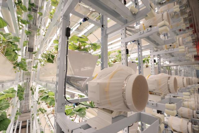 此外,团队在每排种植架安装独立风机,配合新风机实现全域通风,避免植物工厂内闷湿不均,影响草莓生长;还利用种植架的中央管道精准补给二氧化碳,让草莓光合作用更高效,果实更饱满、风味更浓郁。