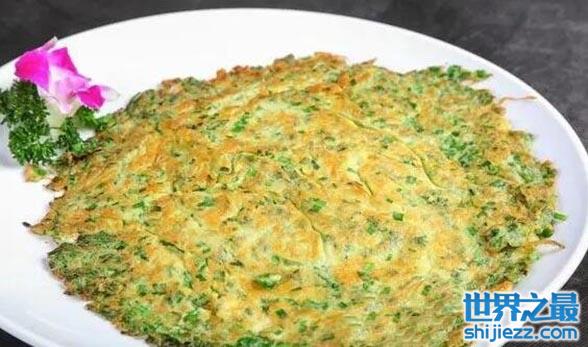 4、锅中放油,油热,倒入香椿鸡蛋液,摊平;蛋液凝固之后可以翻面煎炒,两面金黄的时候就可以出锅了。