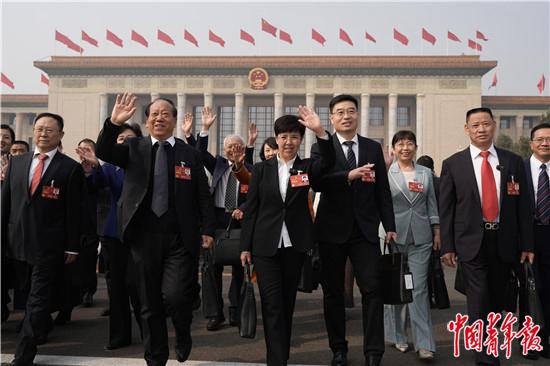 3月5日,十四届全国人大一次会议开幕会结束后,代表们走出人民大会堂,向记者挥手致意。中青报·中青网记者李隽辉/摄
