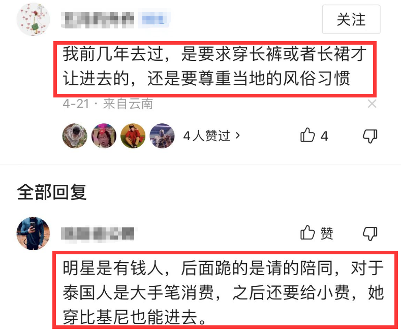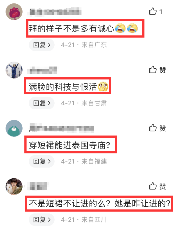 有去过此地拜佛的网友还留言说,之前去时必须要求穿长裤或者长裙才能进去,要尊重当地习俗,不理解金晨为什么如此“特殊”。