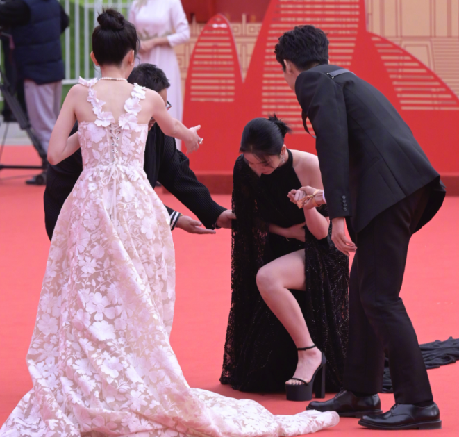比如女星赵小棠,当天她穿着高开叉礼裙,脚踩“恨天高”,美美入场却狼狈摔倒,立刻就登上了热搜。